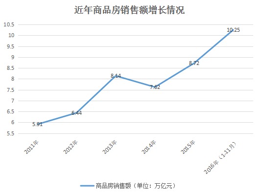 在快要结束的这个2016年,什么东西特别火?相信不少人的答案会是“楼市”。但到底有多火呢?昨日(12月13日),统计局给出了答案。国家统计局13日公布的数据显示,今年1-11月份,商品房销售面积135829万平方米,同比增长24.3%;商品房销售额102503亿元,增长37.5%。由于这还只是今年前11个月的数据,换句话说,不用等到12月数据出炉,中国楼市的年销售额已经首次突破了10万亿元大关!楼市年销售额超韩国澳洲俄罗斯GDP按照实时汇率,10.25万亿元人民币约合14859亿美元。每日经济新闻。根据国外统计网站tradingeconomics数据显示,2015年韩国GDP为13778.7亿美元,紧随其后的澳大利亚、俄罗斯,分别为13395.4亿美元、13260.2亿美元。如下图所示,约合14859亿美元(写作1485.9 USD Billion)的商品房销售额,在绝对数值上,已位于加拿大之下,韩国澳洲俄罗斯之上。单位:十亿美元(USD Billion)房地产销售额当然不能与GDP划等号,但这样的比较并非毫无道理。这是因为,房地产业作为国民经济发展中的基础产业、先导产业和支柱产业,具有产业链长、关联度大、带动性强的特点,不仅以其自身发展直接促进经济增长,还能有效带动相关联的上游与下游产业群的发展,拉动经济增长。事实上,房地产的总产值从消费、投资等方面影响到GDP,并且在这些方面占有极大的份额,可以说房地产行业与GDP息息相关。每日经济新闻记者梳理近年数据发现,2011年全年商品房销售额仅为5.91万亿元;2013-2015年,这一数字大致保持在7-9万亿元之间;总体而言,商品房销售额5年增长了近1倍。数据来源:国家统计局另一方面,今年前11个月的商品房销售面积也刷新了2013年全年创下的13亿平方米的年度历史纪录,为13.58亿平方米,同比增长24.3%;参考同期商品房销售额37.5%的增长,也印证了一件事--房价在涨。根据国家统计局的定义,所谓“商品房销售面积”,指的是报告期内出售新建商品房屋的合同总面积(即双方签署的正式买卖合同中所确认的建筑面积),而“商品房销售额”就是报告期内出售新建商品房屋的合同总价款(即双方签署的正式买卖合同中所确认的合同总价)。二者都是累计数据。换句话说,“碾压”韩国、澳大利亚、俄罗斯三国去年GDP的这10万亿元销售额,都是从购房者腰包里掏出来堆积成的。正在读这篇文章的你,贡献了多少?明年还会破纪录吗?尽管前三季度的旺销,让今年中国楼市的年销售额和销售面积双双突破历史纪录,但必须指出的是,从10月开始,在20多城密集出台的调控政策影响下,楼市热度已出现明显减退。根据国家统计局此前曾在官方网站上公布的10月份上半月和下半月,包括一线城市和部分热点二线城市在内全国15个城市房地产价格的环比情况来看,15个城市中,有7个城市环比价格是下降。而从11月单月来看,楼市数据涨幅也开始明显放缓,增速比1-10月份回落2.5个百分点,市场冲高回落的趋势显著。国家统计局新闻发言人毛盛勇昨日表示,从10月份和11月份房地产价格的数据表现来看,调控取得了初步成效,热点城市或者调控城市房价过快上涨的势头得到了初步遏制。此前,瑞银中国首席经济学家汪涛在接受每日经济新闻记者采访时曾说:“预计今年底和明年,房地产销售会更明显放缓,2017年增速或放缓至0~2%。房地产建设和投资滞后于销售反弹、增速也较为温和,短期内其增长势头或可再持续一段时间。再加上去年同期基数较低,四季度房地产投资应可以保持温和的同比增长,支撑整体GDP。但随着2017年房地产销售增速明显下滑,我们预计届时相关的建设和投资也将放缓。”渣打中国研报分析,尽管目前实际经济运行指标显示四季度增长动能良好,但楼市政策收紧的冲击,以及四季度财政支出减少,预示明年开局或不会太乐观。万科总裁郁亮日前在接受媒体采访时也指出,未来一年内,全国商品住房成交量很有可能大幅下降,前期房价上涨过快的城市,价格也可能回落。他认为,要利用楼市“踩刹车”后的宝贵时机,建立长效机制。记者还注意到,尽管前11个月的房地产投资增速比前10月略有微幅回调,但暂未影响全国固定资产投资增速。1~11月份,全国固定资产投资同比名义增长8.3%,增速与1~10月份持平。另外,今年1~11月份,民间固定资产投资也继续保持回升趋势,同比名义增长3.1%,增速比1~10月份提高0.2个百分点,经济数据继续回暖向好。对此,国家发改委新闻发言人赵辰昕表示,坚持适度扩大总需求、着力推进供给侧结构性改革,在关键领域和薄弱环节加大补短板工作力度,多措并举促进民间投资健康发展,推进投融资体制改革,放管服改革向纵深推进,制定企业投资项目核准和备案条例,优化中央预算内投资安排,加强项目储备和重大工程管理等一系列举措正在发挥积极的成效。12月9日的中共中央政治局会议也提出,加快研究建立符合国情、适应市场规律的房地产平稳健康发展长效机制。