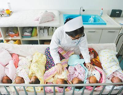 全面放开二孩政策以来,很多高龄妇女加入了生二孩的队伍,各地医院产科迎来婴儿出生潮。图为春节前夕,湖北襄阳第一人民医院产科护士在护理新生儿。陈文摄