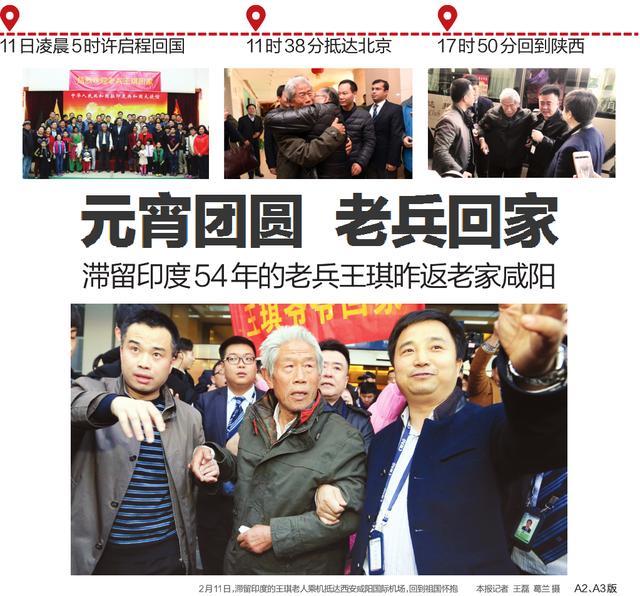2月11日,正月十五元宵节,阖家团圆的日子。就在这天,经多方努力,滞留印度54年的中国老兵王琪,在其儿女的陪同下,于下午乘坐国航航班,经北京平安抵达西安咸阳国际机场,与多年未见的国内亲属团聚,实现了回家的多年夙愿。