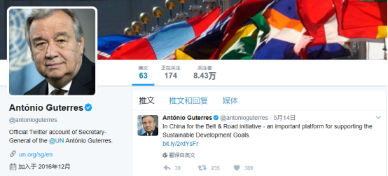 联合国秘书长古特雷斯也在社交媒体谈到了参加“一带一路”论坛,他只发布了一句话,表示“一带一路”倡议是支持联合国可持续发展目标的重要平台。这位敬业的秘书长真是时刻不忘推广联合国的工作。