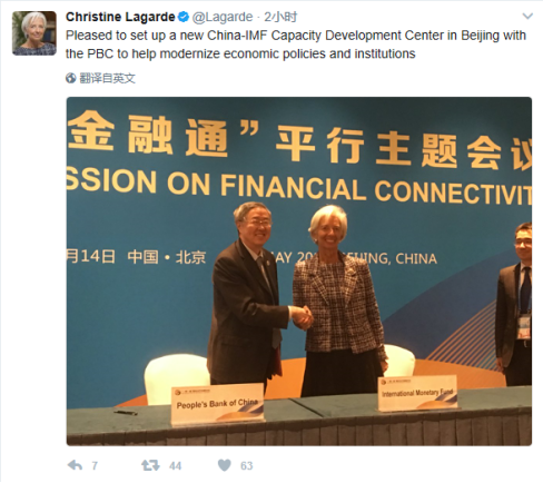 国际货币基金组织总裁拉加德在社交媒体晒出了自己在北京的工作成果。她此次来京可谓“一石三鸟”,不光参加了“一带一路”国际合作高峰论坛,还在15日与中国央行行长周小川共同出席活动,宣布两家机构在华建立联合能力建设中心。此外,她还在京顺道会见了参加论坛的印尼总统佐科以及斐济总理姆拜尼马拉马。