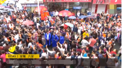 在安徽省六安市郊区大别山深处,毛坦厂中学在清早8时举办2017高考“送考节”,平日安静的毛坦厂镇人声鼎沸,擂鼓喧天,一场“送考狂欢”在江南毛毛细雨中上演。在送考大街上,镇上百姓们悬挂起“滴水穿石何所惧,蟾宫摘桂正当时”、“长风破浪会有时,直挂云帆济沧海”等红色横幅,醒目耀眼。