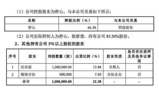 上海维情网络科技股份有限公司维情股份的《公开转让说明书》显示,维情公司成立于2009年,股份公司成立于2016年,目前注册资本为800万元。维情股份主要从事婚姻家庭咨询与服务的业务,法定代表人是舒心。公司的实际控制人为合计持股85.50%的舒心、徐新蕾夫妻二人,均为"60后"。舒心曾在上海宜川街道社区服务中心工作8年半之久,徐新蕾则毕业于心理咨询与治疗培训中心(海南)。