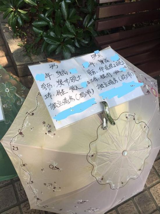 人民公园相亲角内,家长用雨伞“晒”出的子女资料。