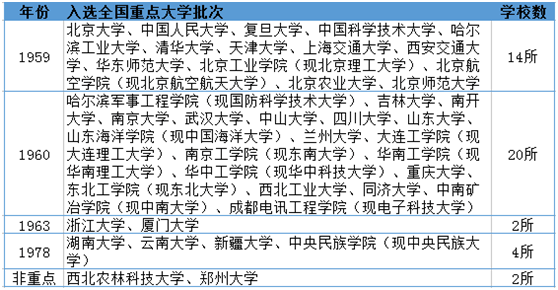全国重点大学从1959年开始,总共分为了五个批次,入选批次越早的高校其权重也就越高,说明国家对其越为重视。