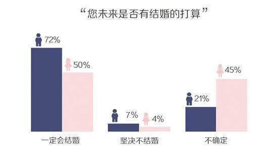 在本次调查中,有72%的男生表示自己未来一定会结婚,而只有51%的女生认为自己未来一定会结婚。21%的男生对未来结婚呈现出迷茫状态,女生的比例为男生的两倍多,达到45%。坚持不婚的比例占少数,其中男生占7%,女生占4%。