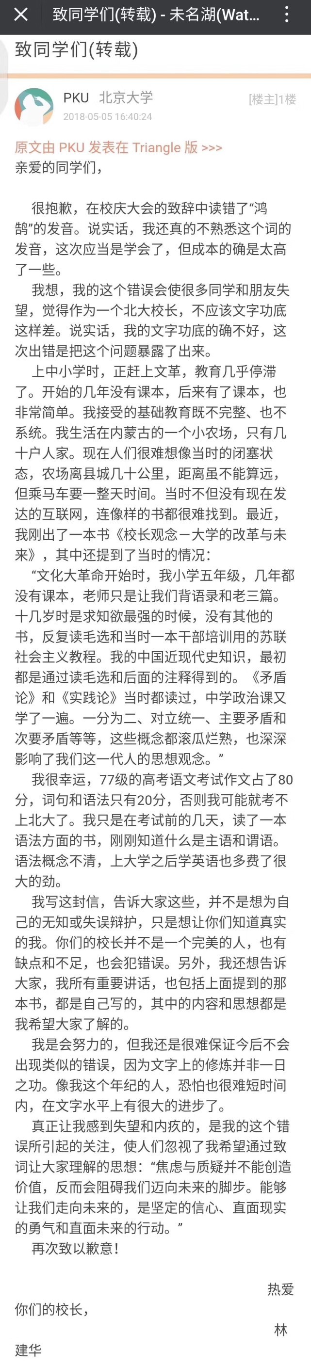 “下文”客户端发现,今天中午,北大校长林建华在北大BBS论坛上发表道歉信称: