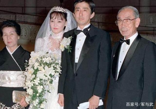 1987年日本首相安倍晋三和妻子安倍昭惠结婚,照片中母亲的表情略显严肃