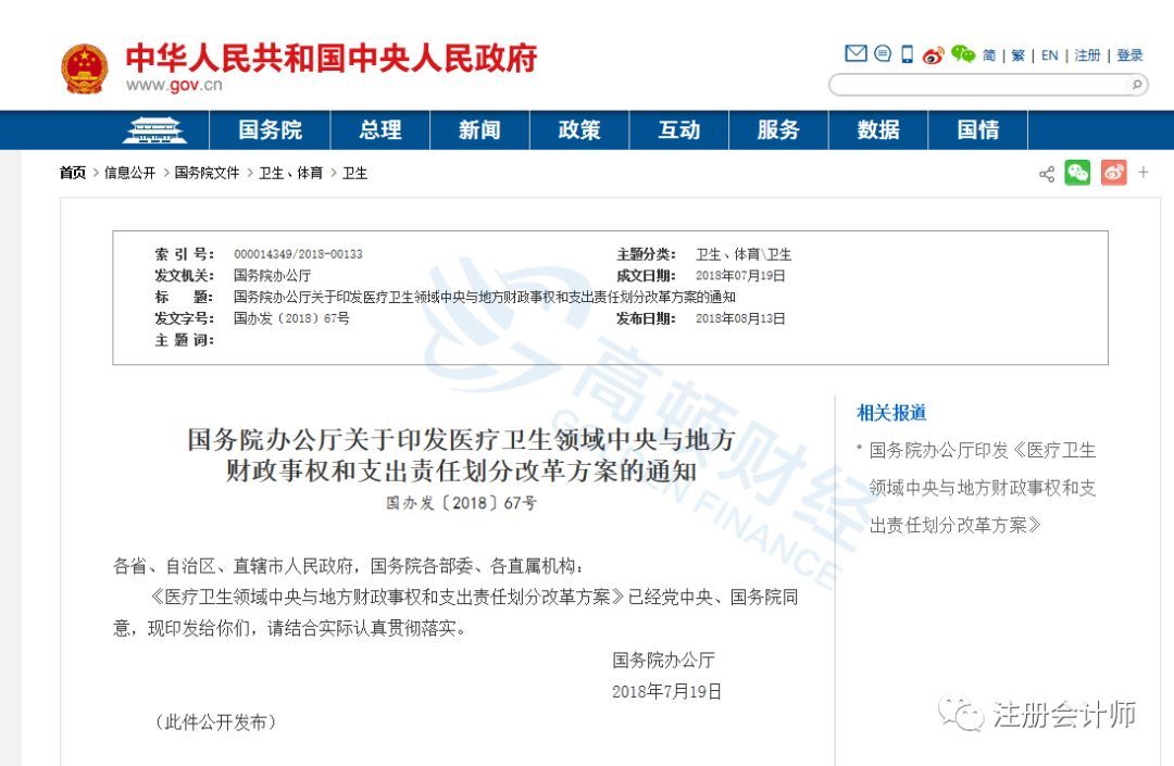 查阅了相关的文件,原来是国务院在去年8月份印发了《关于印发医疗卫生领域中央与地方财政事权和支出责任划分改革方案的通知》