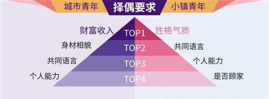 数据显示,在择偶要求上,城市青年优先看重“财富收入”、“身材相貌”和“共同语言”,其次是个人能力、性格气质。而小镇青年,则更加看重“性格气质”,其次是共同语言、个人能力、是否顾家。可见,面临更多经济压力的城市青年,在择偶时更加看重“财富收入”,而小镇青年则更在意“性格气质”。