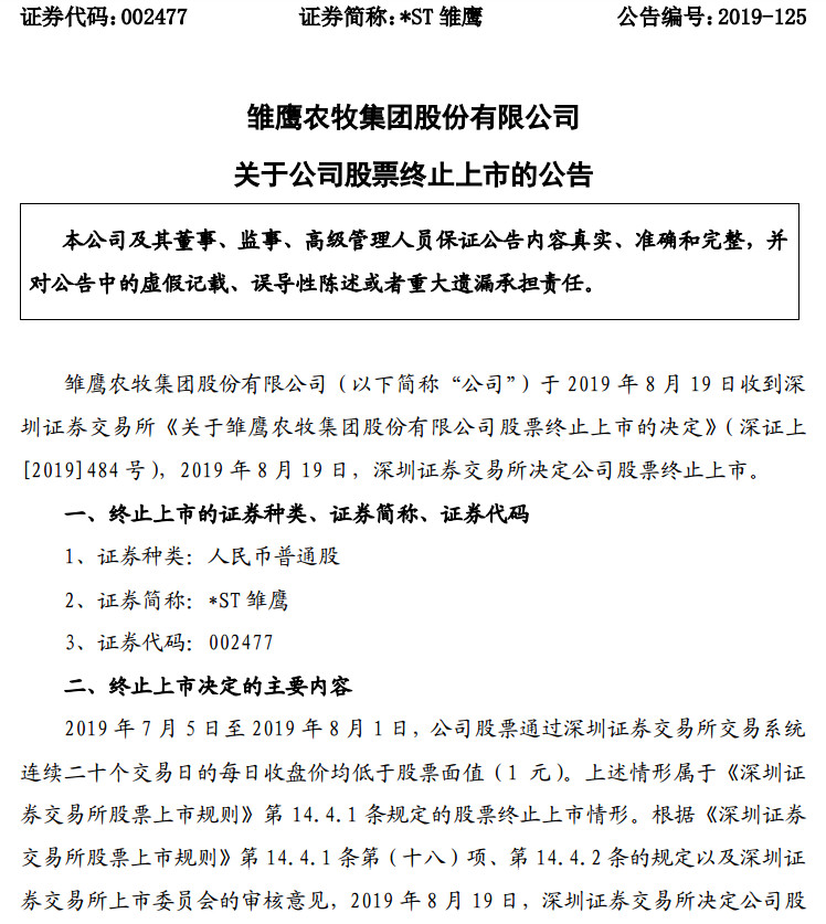 就在刚刚,深交所网站8月19日显示,养猪第一股雏鹰农牧(*ST雏鹰)被终止上市。