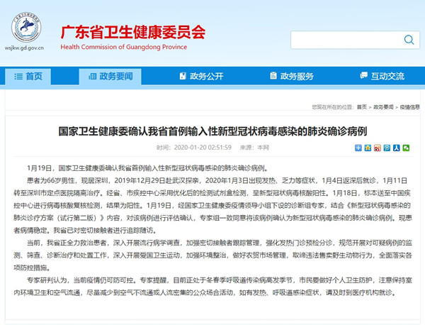 广东省卫生健康委员会刚刚发布消息,1月19日,国家卫生健康委确认广东省首例输入性新型冠状病毒感染的肺炎确诊病例。