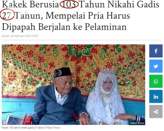 在位于印尼的南苏拉威西地区曝出一段特殊的曾祖孙恋情,一名103岁高龄的老翁与27岁女子坠入爱河,并最终修成正果,据新娘称,两人系奉子成婚。近日,在当地宗教局工作人员的见证下,两人正式步入婚姻殿堂。婚礼视频一经上传到社交媒体上,便立即引发网友热议。