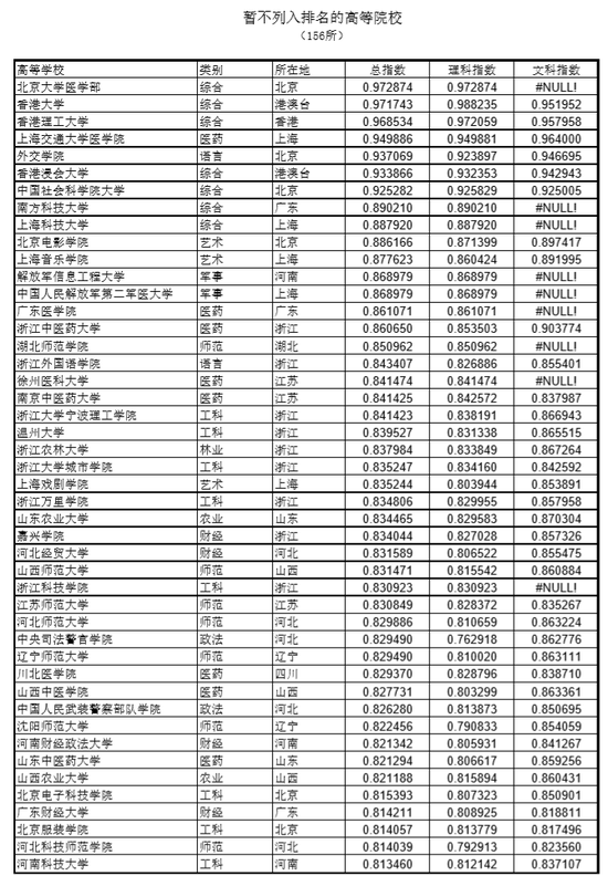 这份总榜单包括了各大高校过去十年间的录取分数总排名,不过共有156所院校未参与总排名。暂不列入排名的院校是由于其在2008--2017年之间,参与第一批录取的年数少于4年或者招生的区域少于6个地区或者是某个大学的单列院(部)。 未参与总排名的高校具体名单可以点击 “左下角的”阅读原文“或访问 青塔网(www.cingta.com)查阅。