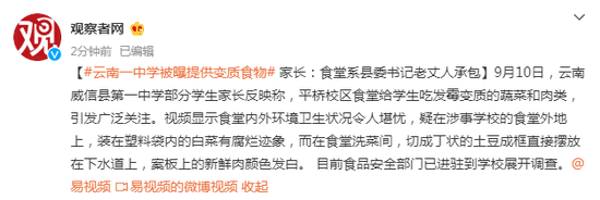 9月10日,一则视频称,云南威信一中部分学生家长反映平桥校区食堂给学生吃发霉变质的蔬菜和肉类,引发关注。