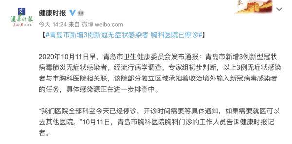 据健康时报报道,10月11日,青岛市胸科医院胸科门诊的工作人员表示,医院全部科室今天已经停诊。工作人员表示,该医院是收治新冠肺炎的定点医院,现在还有新冠肺炎患者在院,但是确诊患者的住院区域与其他住院患者是分开的。