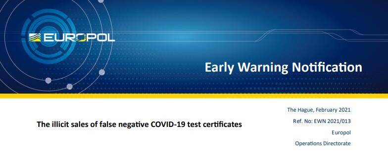 2月2日,欧洲刑警组织(Europol)发文警告称,已证实欧洲多地出现了非法制售新冠核酸阴性报告的案件,涉及英、法、西、荷等国,伪造的阴性证明售价通常在40-300欧元之间,各国应保持警惕。