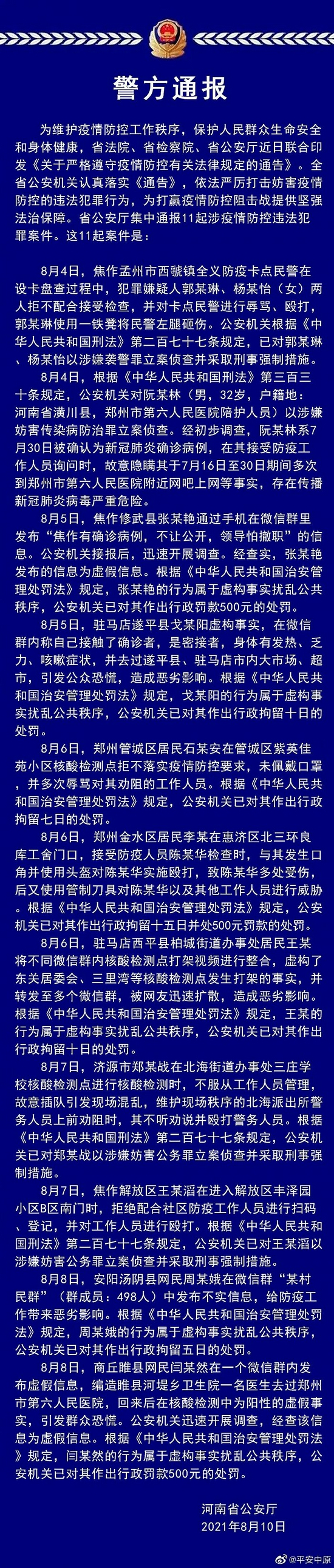 据@平安中原 消息,8月11日凌晨,河南省公安厅集中通报11起涉疫情防控违法犯罪案件。这11起案件分别是:8月4日,焦作孟州市西虢镇全义防疫卡点民警在设卡盘查过程中,犯罪嫌疑人郭某琳、杨某怡(女)两人拒不配合接受检查,并对卡点民警进行辱骂、殴打,郭某琳使用一铁凳将民警左腿砸伤。公安机关根据《中华人民共和国刑法》第二百七十七条规定,已对郭某琳、杨某怡以涉嫌袭警罪立案侦查并采取刑事强制措施。8月4日,根据《中华人民共和国刑法》第三百三十条规定,公安机关对阮某林(男,32岁,户籍地:河南省潢川县,郑州市第六人民医院陪护人员)以涉嫌妨害传染病防治罪立案侦查。经初步调查,阮某林系7月30日被确认为新冠肺炎确诊病例,在其接受防疫工作人员询问时,故意隐瞒其于7月16日至30日期间多次到郑州市第六人民医院附近网吧上网等事实,存在传播新冠肺炎病毒严重危险。8月5日,焦作修武县张某艳通过手机在微信群里发布“焦作有确诊病例,不让公开,领导怕撤职”的信息。公安机关接报后,迅速开展调查。经查实,张某艳发布的信息为虚假信息。根据《中华人民共和国治安管理处罚法》规定,张某艳的行为属于虚构事实扰乱公共秩序,公安机关已对其作出行政罚款500元的处罚。8月5日,驻马店遂平县戈某阳虚构事实,在微信群内称自己接触了确诊者,是密接者,身体有发热、乏力、咳嗽症状,并去过遂平县、驻马店市内大市场、超市,引发公众恐慌,造成恶劣影响。根据《中华人民共和国治安管理处罚法》规定,戈某阳的行为属于虚构事实扰乱公共秩序,公安机关已对其作出行政拘留十日的处罚。8月6日,郑州管城区居民石某安在管城区紫英佳苑小区核酸检测点拒不落实疫情防控要求,未佩戴口罩,并多次辱骂对其劝阻的工作人员。根据《中华人民共和国治安管理处罚法》规定,公安机关已对其作出行政拘留七日的处罚。8月6日,郑州金水区居民李某在惠济区北三环良库工舍门口,接受防疫人员陈某华检查时,与其发生口角并使用头盔对陈某华实施殴打,致陈某华多处受伤,后又使用管制刀具对陈某华以及其他工作人员进行威胁。根据《中华人民共和国治安管理处罚法》规定,公安机关已对其作出行政拘留十五日并处500元罚款的处罚。8月6日,驻马店西平县柏城街道办事处居民王某将不同微信群内核酸检测点打架视频进行整合,虚构了东关居委会、三里湾等核酸检测点发生打架的事实,并转发至多个微信群,被网友迅速扩散,造成恶劣影响。根据《中华人民共和国治安管理处罚法》规定,王某的行为属于虚构事实扰乱公共秩序,公安机关已对其作出行政拘留十日的处罚。8月7日,济源市郑某战在北海街道办事处三庄学校核酸检测点进行核酸检测时,不服从工作人员管理,故意插队引发现场混乱,维护现场秩序的北海派出所警务人员上前劝阻时,其不听劝说并殴打警务人员。根据《中华人民共和国刑法》第二百七十七条规定,公安机关已对郑某战以涉嫌妨害公务罪立案侦查并采取刑事强制措施。8月7日,焦作解放区王某滔在进入解放区丰泽园小区B区南门时,拒绝配合社区防疫工作人员进行扫码、登记,并对工作人员进行殴打。根据《中华人民共和国刑法》第二百七十七条规定,公安机关已对王某滔以涉嫌妨害公务罪立案侦查并采取刑事强制措施。8月8日,安阳汤阴县网民周某娥在微信群“某村民群”(群成员:498人)中发布不实信息,给防疫工作带来恶劣影响。根据《中华人民共和国治安管理处罚法》规定,周某娥的行为属于虚构事实扰乱公共秩序,公安机关已对其作出行政拘留五日的处罚。8月8日,商丘睢县网民闫某然在一个微信群内发布虚假信息,编造睢县河堤乡卫生院一名医生去过郑州市第六人民医院,回来后在核酸检测中为阳性的虚假事实,引发群众恐慌。公安机关迅速开展调查,经查该信息为虚假信息。根据《中华人民共和国治安管理处罚法》规定,闫某然的行为属于虚构事实扰乱公共秩序,公安机关已对其作出行政罚款500元的处罚。