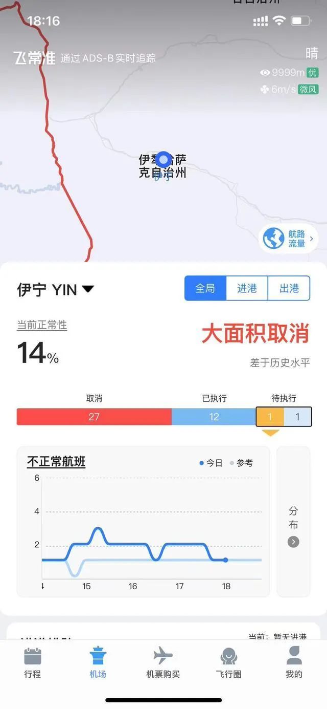 另据@正观新闻 报道,新疆乌鲁木齐地窝堡、库尔勒、阿克苏、伊宁等多个机场进出港航班均大面积取消。截至3日22:30分 ,伊宁机场国内进、出港航班分别取消13次和11次 ;国内进、出港航班取消率分别为72%和61%。