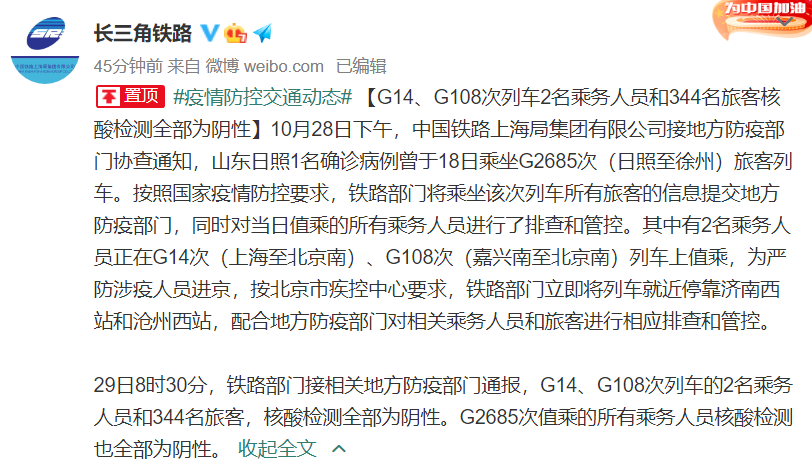 10月28日下午,上海铁路局集团公司接地方防疫部门协查通知,山东日照1名确诊病例曾于18日乘坐G2685次(日照至徐州)旅客列车。按照国家疫情防控要求,铁路部门将乘坐该次列车所有旅客的信息提交地方防疫部门,同时对当日值乘的所有乘务人员进行了排查和管控。其中有2名乘务人员正在G14次(上海至北京南)、G108次(嘉兴南至北京南)列车上值乘,为严防涉疫人员进京,按北京市疾控中心要求,铁路部门立即将列车就近停靠济南西站和沧州西站,配合地方防疫部门对相关乘务人员和旅客进行相应排查和管控。29日8时30分,铁路部门接相关地方防疫部门通报,G14、G108次列车的2名乘务人员和344名旅客,核酸检测全部为阴性。G2685次值乘的所有乘务人员核酸检测也全部为阴性。@长三角铁路 微博截图@长三角铁路 微博截图