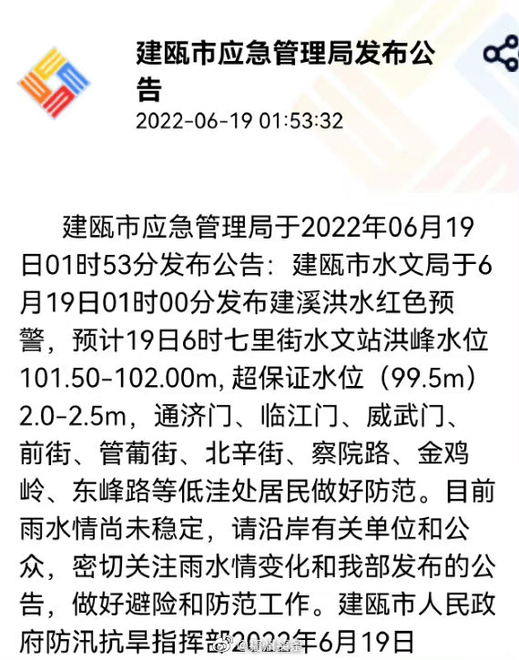 建瓯市应急管理局于2022年06月19日01时53分发布公告:建瓯市水文局于6月19日01时00分发布建溪洪水红色预警,预计19日 6时 七里街水文站洪峰水位 101.50-102.00m, 超保证水位(99.5m)2.0-2.5m,通济门、临江门、威武门、前街、管葡街、北辛街、察院路、金鸡岭、东峰路等低洼处居民做好防范。目前雨水情尚未稳定,请沿岸有关单位和公众,密切关注雨水情变化和建瓯市人民政府防汛抗旱指挥部发布的公告,做好避险和防范工作。
