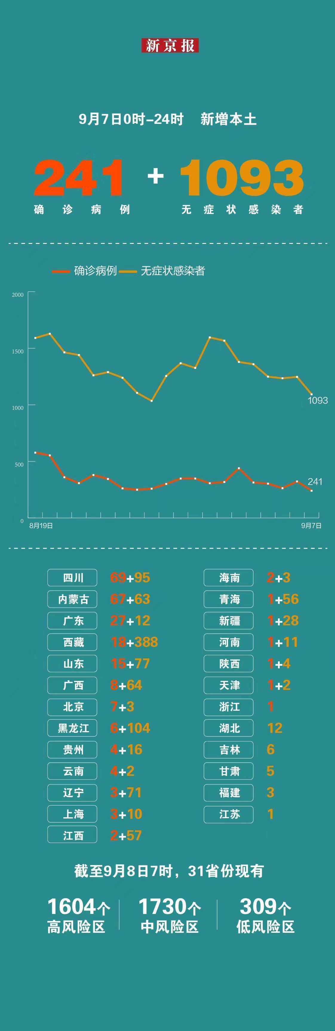 卫健委:9月7日新增确诊280例无症状1159例、其中本土确诊241例无症状1093例