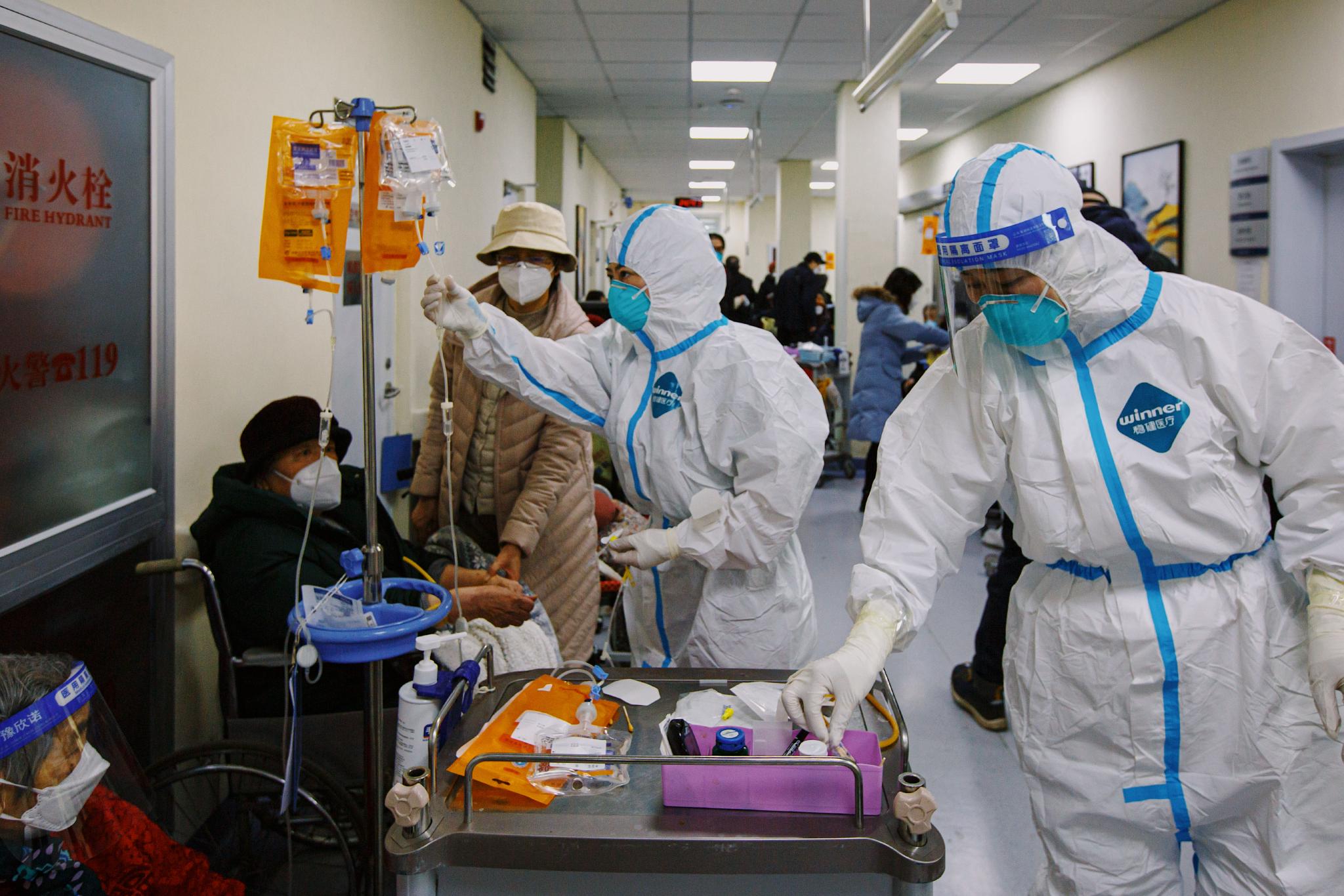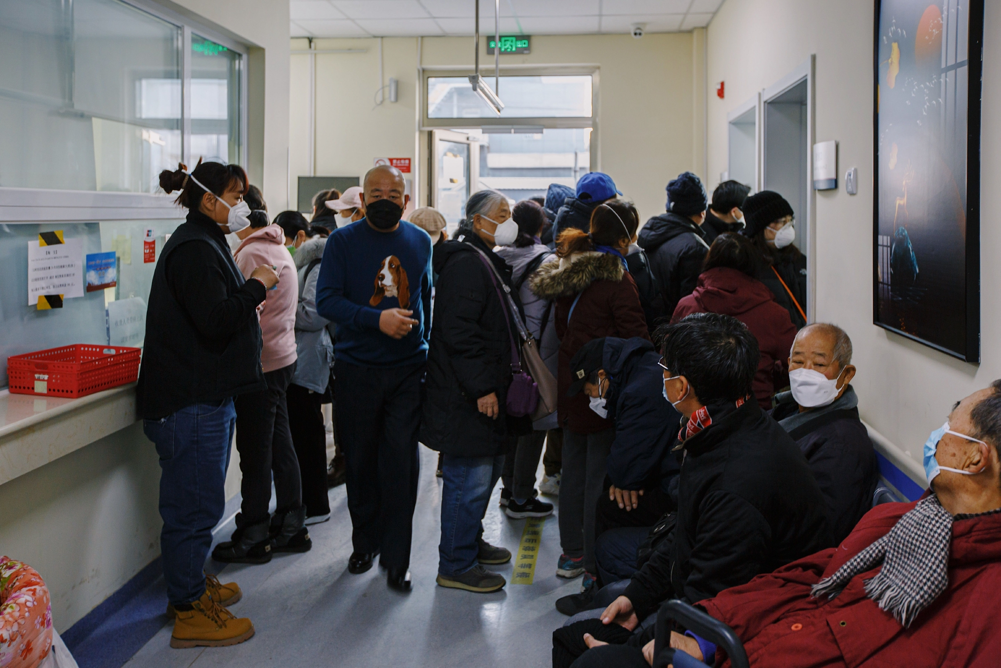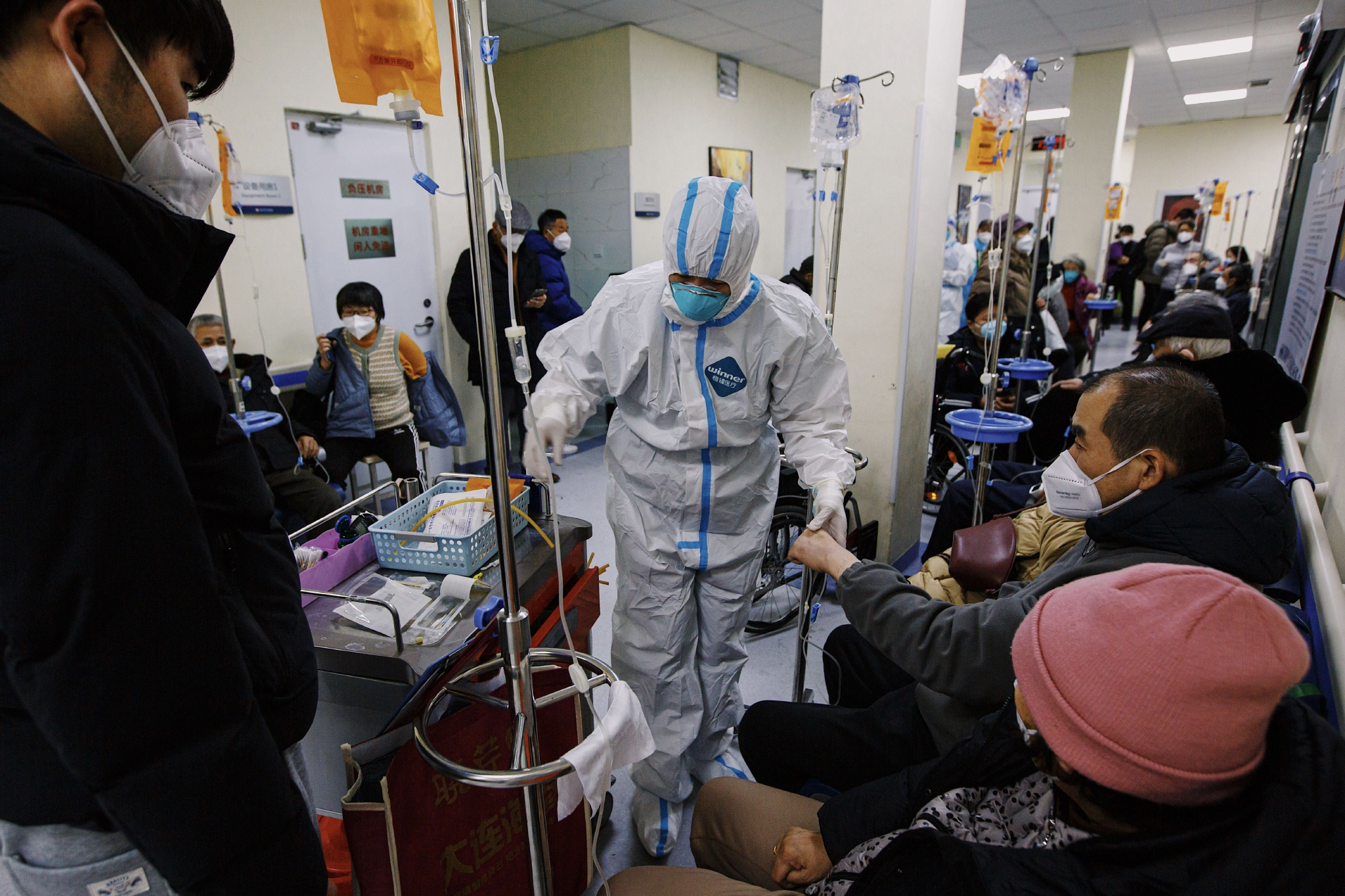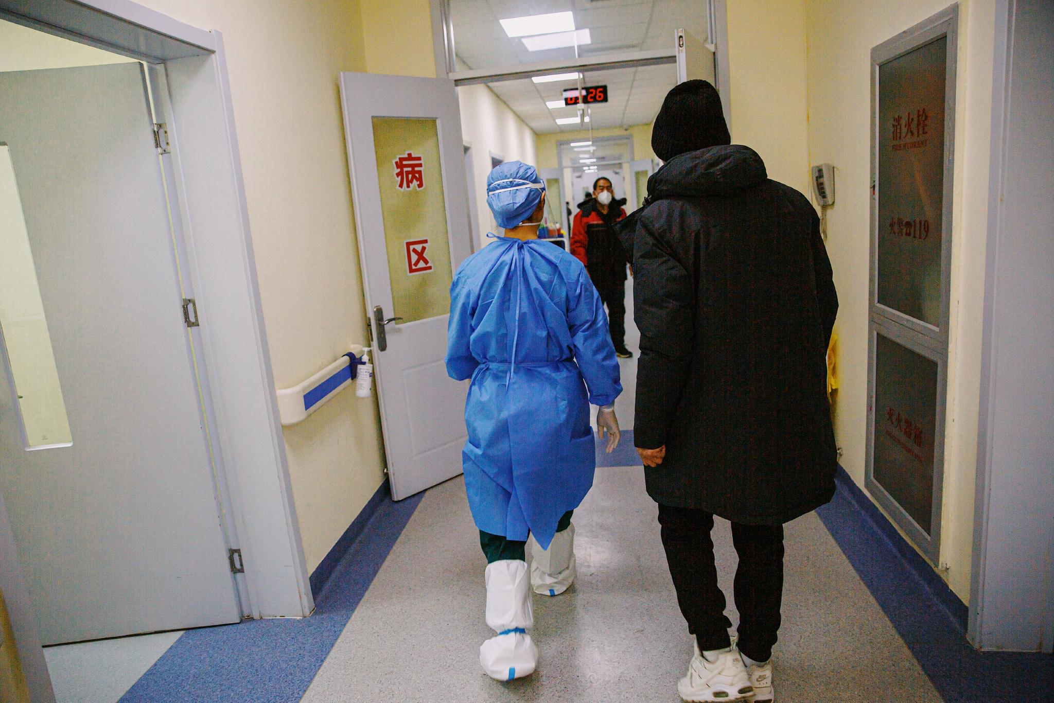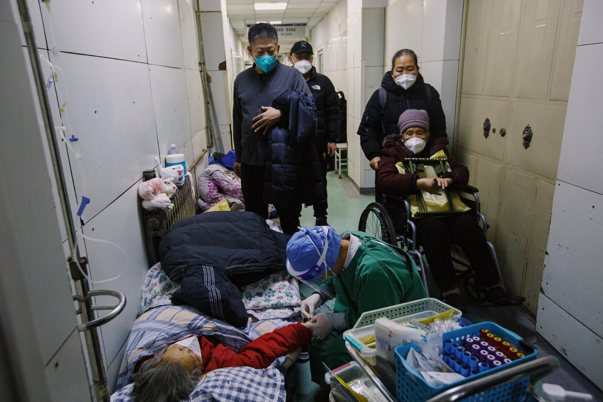 2022年12月7日,国务院防疫优化措施“新十条”落地,8日,明确所有的医疗机构不能拒诊核酸阳性患者。发热门诊一下子涌入了很多发热患者。2022年12月26日,北京大学首钢医院发热门诊,护士为患者输液。2022年12月26日,北京大学首钢医院急诊,医务人员救治一名经由救护车转运来的患者。2022年12月26日,北京大学首钢医院发热门诊,一名长时间工作的护士蹲在墙边喘口气。
