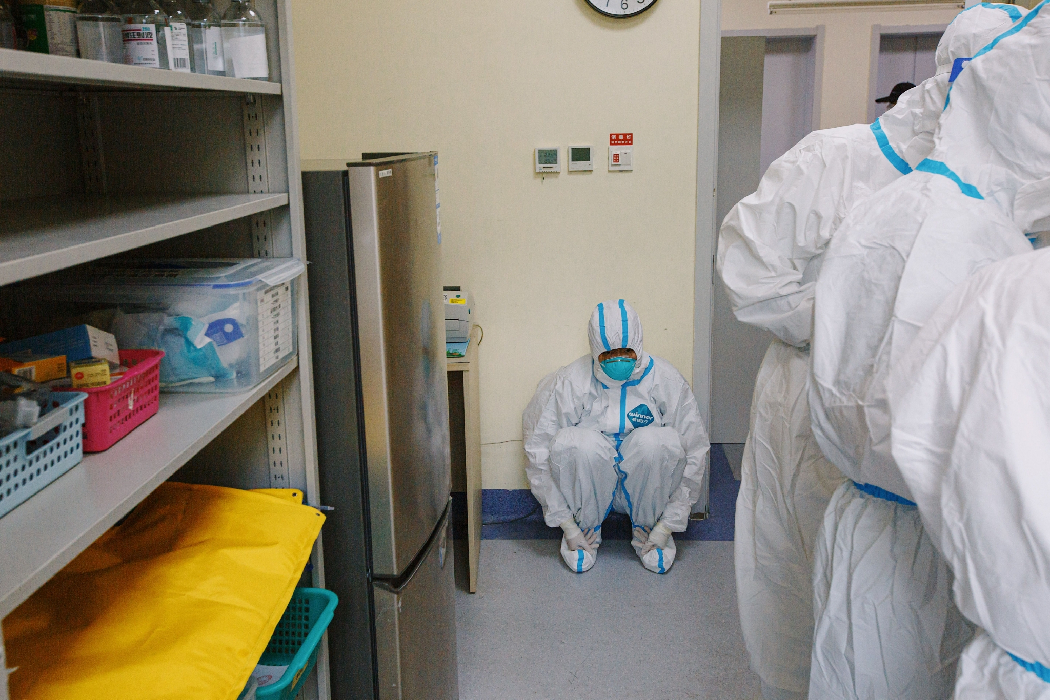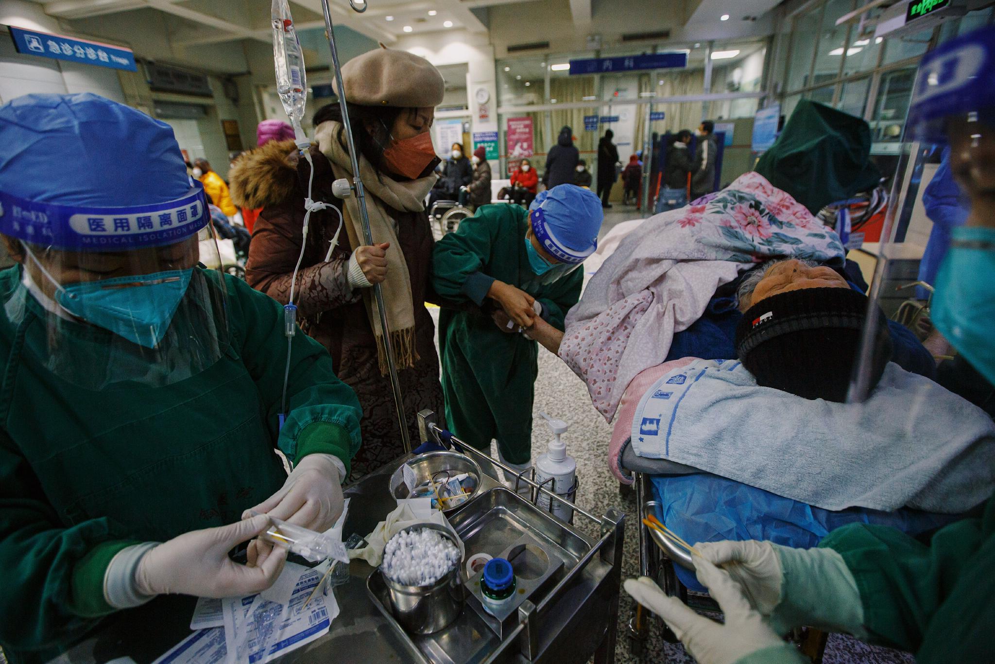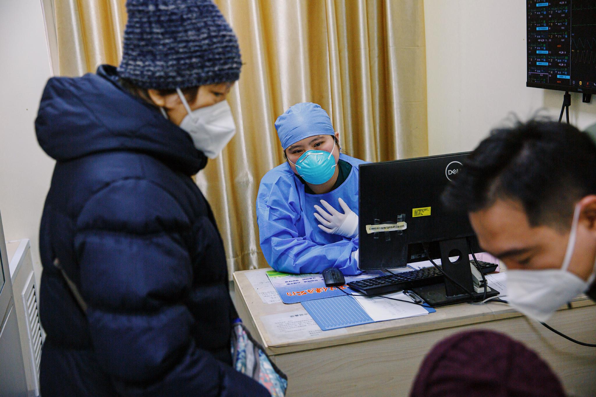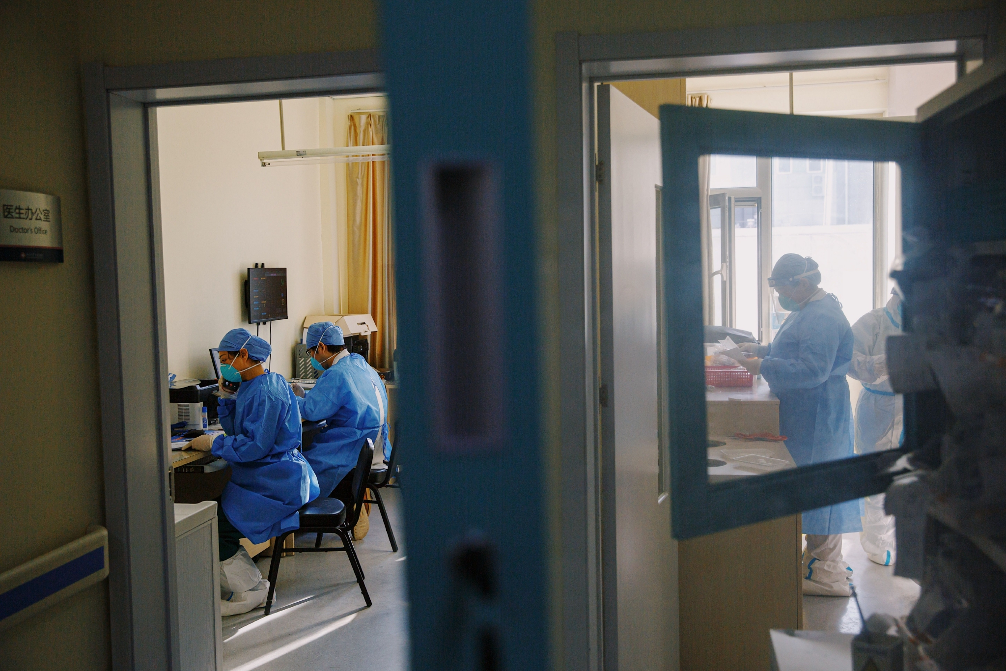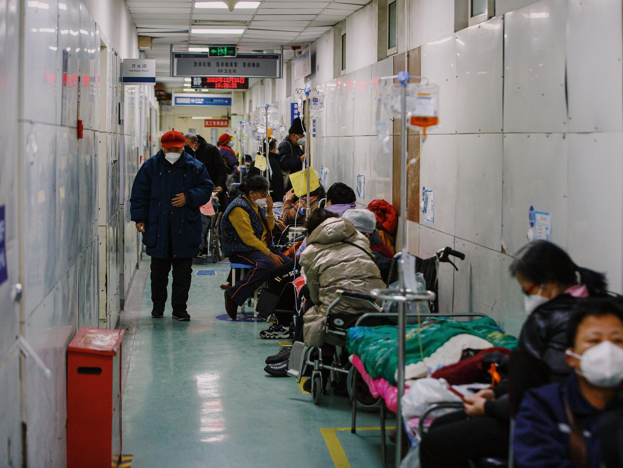2022年12月7日,国务院防疫优化措施“新十条”落地,8日,明确所有的医疗机构不能拒诊核酸阳性患者。发热门诊一下子涌入了很多发热患者。2022年12月26日,北京大学首钢医院发热门诊,护士为患者输液。2022年12月26日,北京大学首钢医院急诊,医务人员救治一名经由救护车转运来的患者。2022年12月26日,北京大学首钢医院发热门诊,一名长时间工作的护士蹲在墙边喘口气。