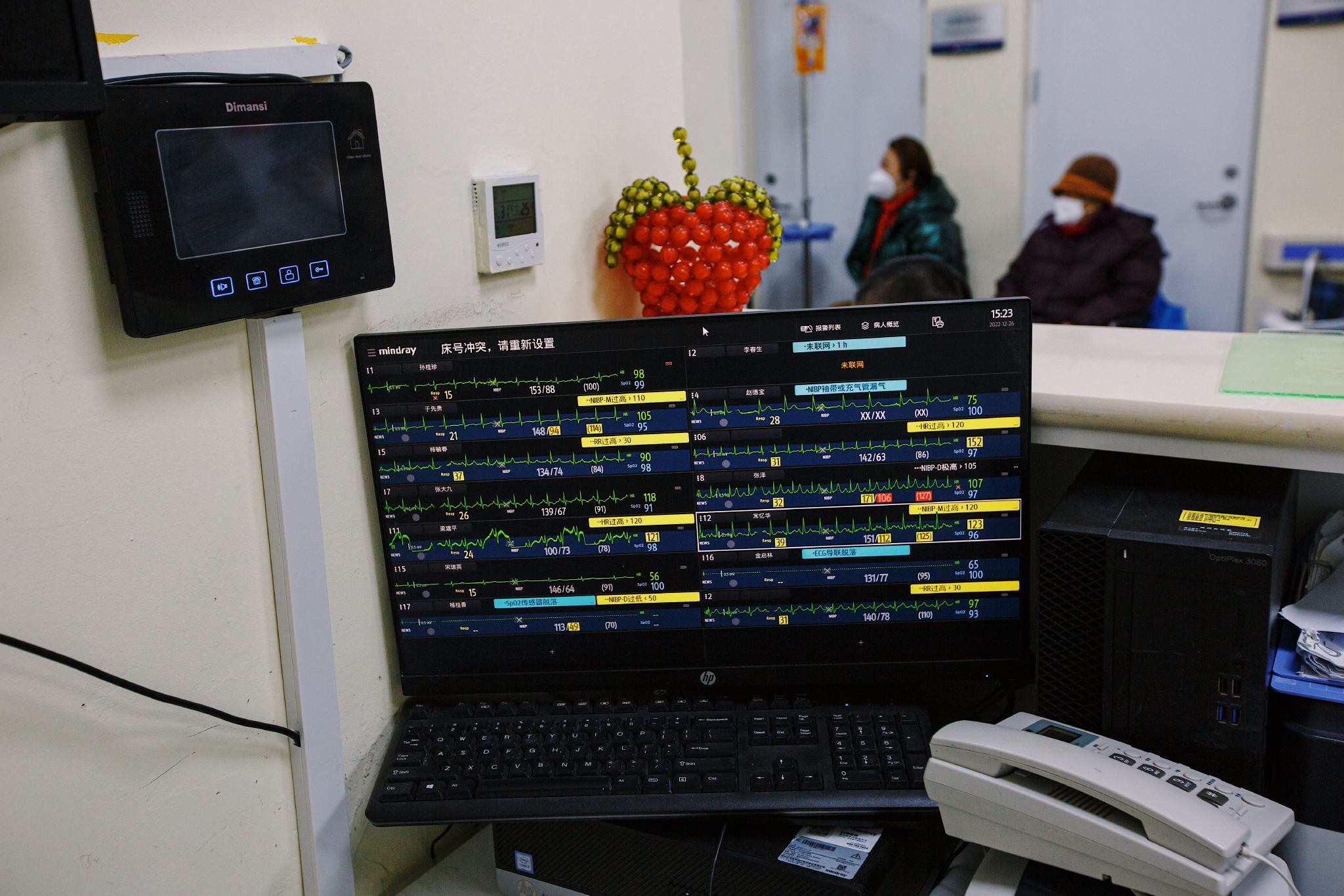 2022年12月31日早上九点,北京大学首钢医院发热门诊当天的挂号量已经达到101,发热门诊大厅两边均是输液的患者和家属,不断听到有人喊“护士,拔针”“护士,换液”“护士,吸痰”。再往里面是留观病房,住着重症和危重症患者。发热门诊的医生王甜甜说:“平时发热门诊一天的接诊量在20-50人之间,最近一段时间平均每天接诊量超过250人,甚至有一天超过300人。”