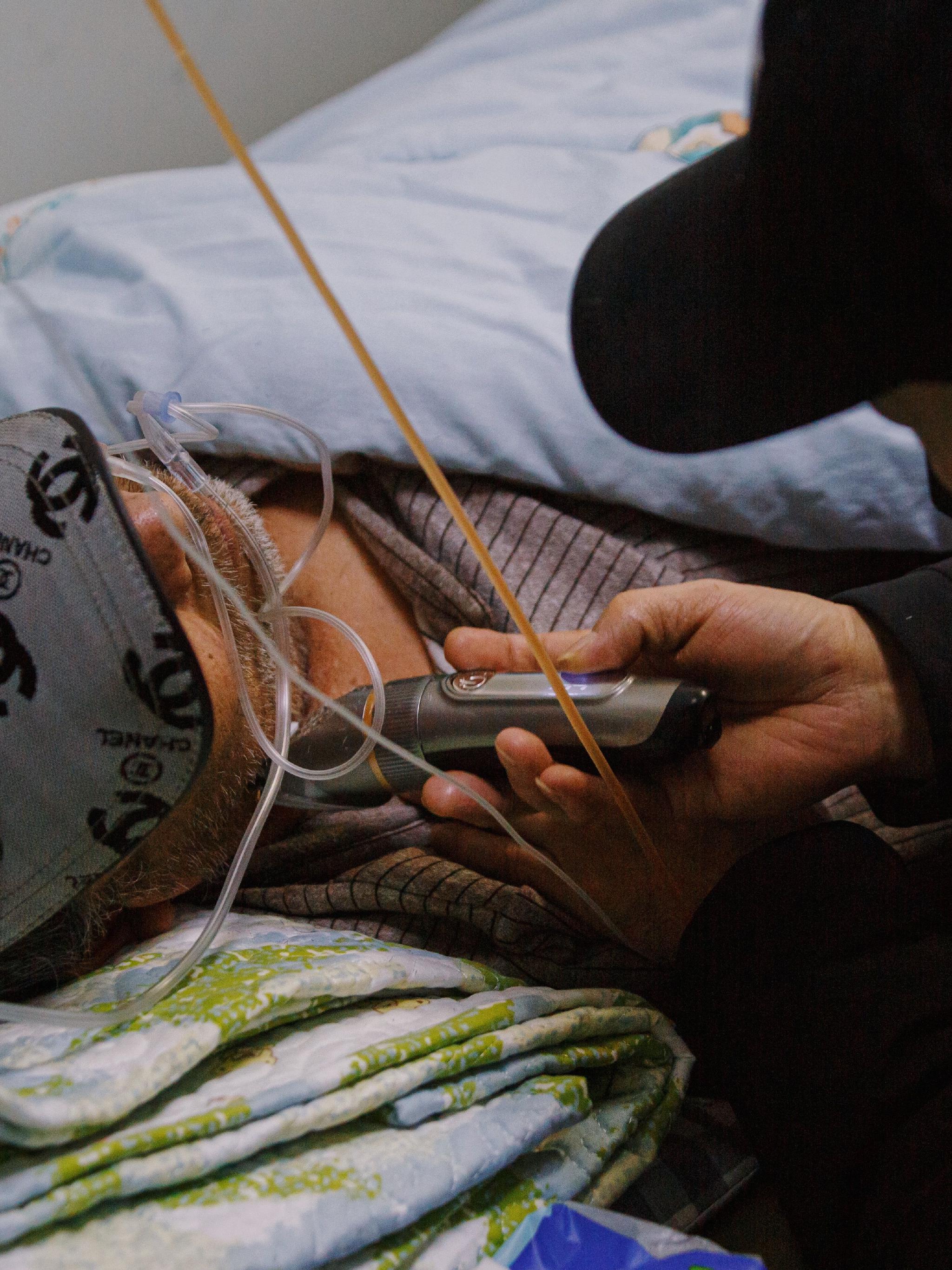 留观室内发热门诊大厅几十米外的留观室,住着新冠重症和危重症患者。按照流程,如果患者只是一般的肺部感染,由发热门诊的医生开药处理。当患者的情况危急时,王甜甜就会拿起一旁的座机,打电话给留观室的张丹。2022年12月31日,北京大学首钢医院发热门诊,医务人员在紧张忙碌2022年12月31日,北京大学首钢医院发热门诊留观区,医生张丹小跑赶往病房发热门诊主任张丹穿着蓝色的防护服,戴着防护面罩,她走路速度很快,步子迈得很大。除了感染新冠发烧休息了2天,张丹已经上了一个多月的班了,眼神中有挡不住的疲惫,“每天不到八点就到,一直到晚上十一二点才回去。”她和许静一样,平时就住在医生办公室。病房内,一位老人躺在病床上,眼睛闭得只剩下一条缝,白色的管子插入老人的鼻腔,氧气顺着管道慢慢送进老人体内,嘴巴张大,大口喘气,一旁的心电监护仪发出滴滴声。2022年12月31日,北京大学首钢医院发热门诊,医生张丹在留观区病房查看病人输液情况其他患者家属看到张丹,纷纷走到病房门口,“老太太觉得浑身难受”“这个指标还是很低”。张丹走过去,一一检查了各项指标,“这个叫护士”“这个刚用上药,要再观察一会儿。”张丹介绍,现阶段留观室住着的发热患者大多是一些有基础疾病的老人,糖尿病、冠心病、心衰,包括肾功能不好,都需要卧床,吸氧,“我们现在基本上跟急诊是一样的,插管、上呼吸机、抢救,都非常娴熟。”2022年12月26日,北京大学首钢医院急诊,医务人员紧张忙碌。2022年12月26日,北京大学首钢医院急诊,患者家属为其刮胡子。2022年12月26日,北京大学首钢医院发热门诊,家属给老人喂食。2022年12月26日,北京大学首钢医院发热门诊,留观室病人的监测屏幕提示病人监测数值异常。当问及这些医护人员,他们需要哪些支持时,受访的医护人员没有人提到工薪待遇问题,他们说的是需要药物、需要监护设备、需要将病房扩建、需要更多医护人员,让患者得到更好的照顾。