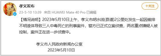 5月10日上午,新京报记者从山西吕梁孝义市人民政府新闻办公室获悉,孝义市胡水线(县道)2公里处发生一起中毒死亡事件。孝义警方初步判定,该事件系一起因偷排不明液体致三人中毒死亡的刑事案件,两名重点嫌疑人被控制,案件正在进一步侦查中。