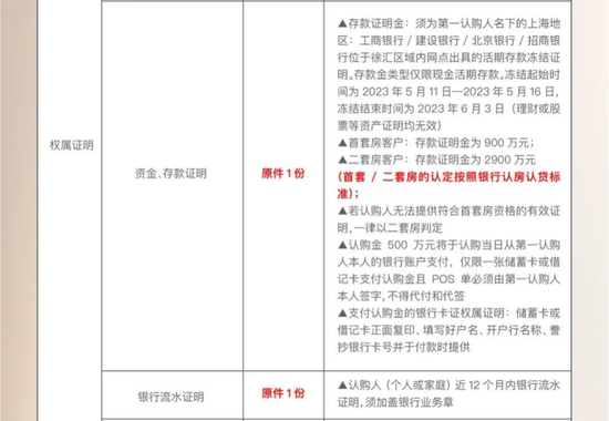 首先,首套房客户的冻结资金是900万元,二套房为2900万元,存款证明必须指定在4家重点银行,并要求在徐汇区域的网点开具。存款金类型仅限于现金活期存款,而且5月11日之前开具的无效。