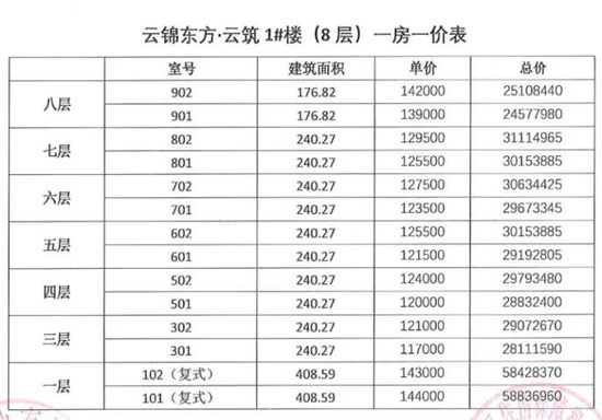 公开资料显示,云锦东方备案均价为16.4907万元/平方米,其中洋房均价13.2万元/平方米,别墅均价17.82万元/平方米,房源总价约2457.7万元至9618万元。