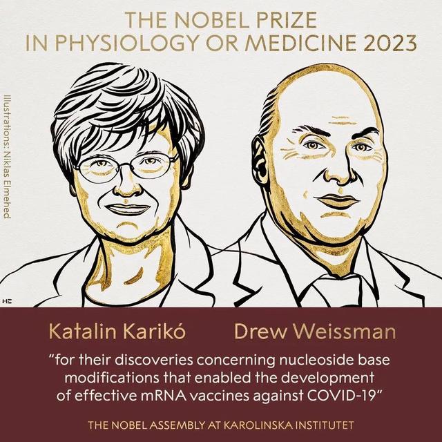 2023年10月2日下午5点45分,2023年诺贝尔生理学或医学奖花落卡塔林·卡里科(Katalin Karikó)和德鲁·维斯曼(Drew Weissman),他们因为研发的mRNA技术,推动COVID-19 的 mRNA 疫苗发展而获奖。