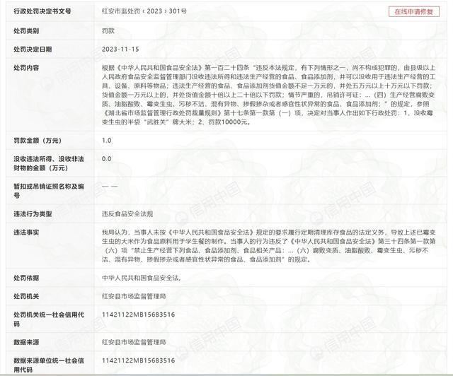 湖北省红安县觅儿寺镇中心学校因使用霉变生虫的大米做学生餐,被红安县市场监督管理局开出1万元罚单。