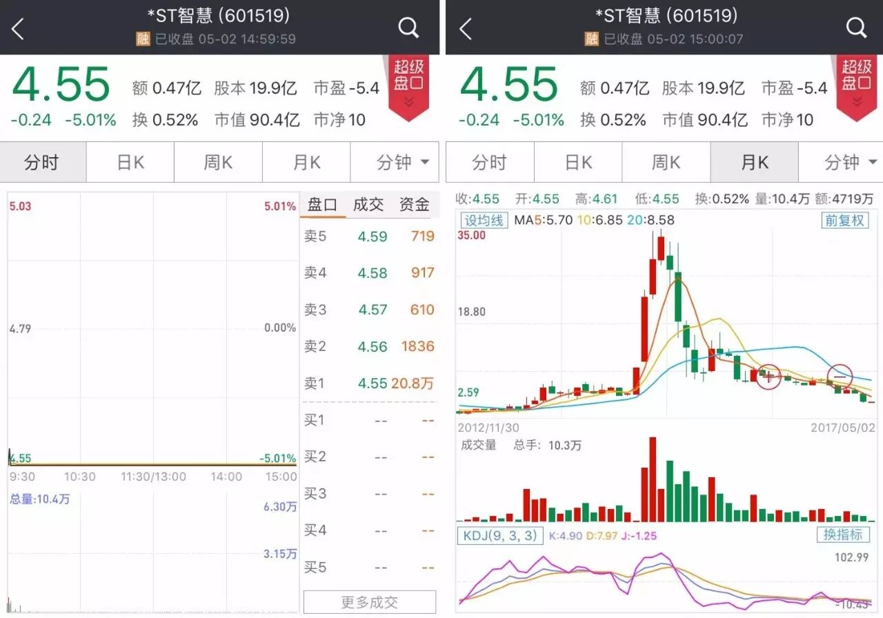 今天大智慧开盘直接跌停,报收4.55元,跌幅5.01%,因为2015年、2016年连续两年的净利润为负值,大智慧被实施“退市风险警示”,自5月2日起名字变更为“*ST智慧”。股灾后一路下跌,如今大智慧的总市值仅为90.4亿元,与同行业的东方财富(11.030, 0.01, 0.09%)471亿元的市值、同花顺(57.250, 1.25, 2.23%)301亿元的市值相比,相去甚远。