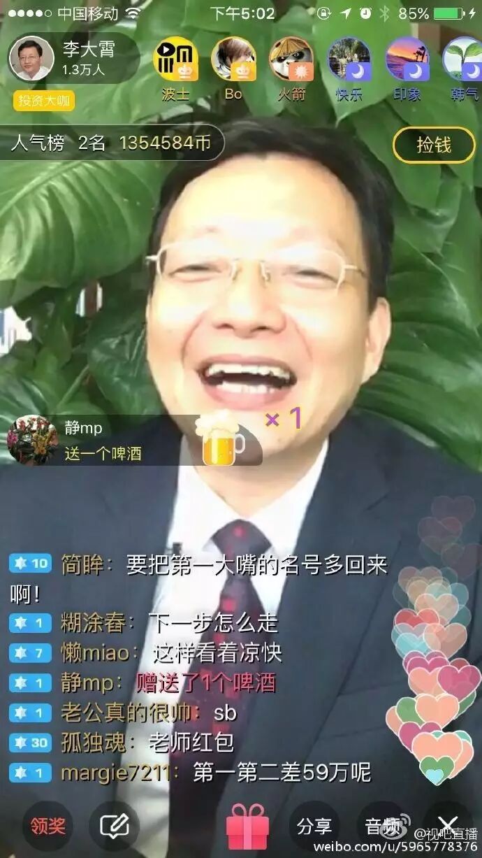 还有呢,就是提出婴儿底、钻石底一言成名,财经界“网红”、萌萌哒英大证券研究所所长李大霄,第一大嘴的魅力也难挡,在“视吧”人气也不差。