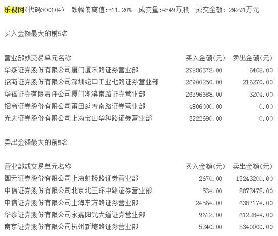新浪财经讯 3月19日,乐视网(5.340, -0.59, -9.95%)再度一字跌停,交易所盘后数据显示,华泰证券(17.270, -0.06, -0.35%)厦门厦禾路、招商证券(17.030, 0.00, 0.00%)深圳蛇口工业七路、华福证券厦门湖滨南路分别买入2988万元、2690万元、2639万元,国元证券(9.350, 0.05, 0.54%)上海虹桥路卖出1324万元。