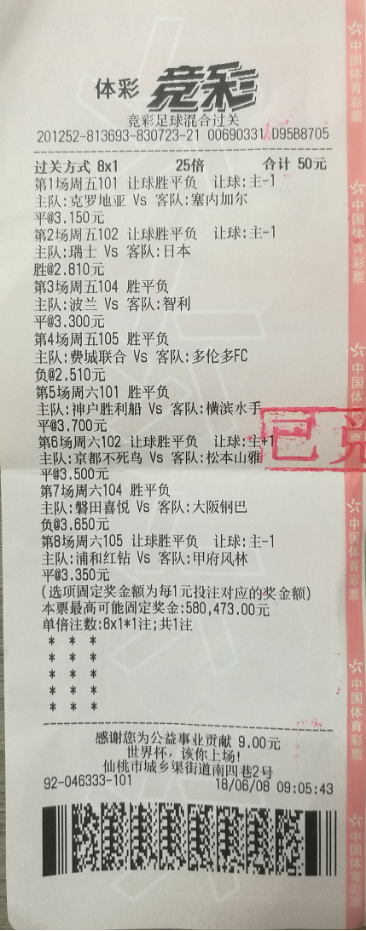 竞彩串串中出了58万元大奖?工作人员拿过票来一看,顿时大为折服:李先生的中奖彩票采用的是8串1投注方式,主攻高赔的平和让平,故而只投注了50元即中得大奖58万元。