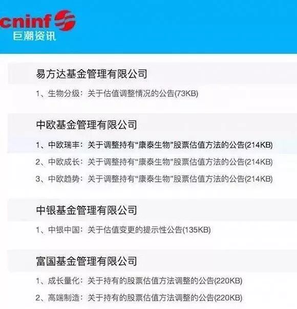7月23日,融通基金率先发布公告,将康泰生物估值下调至46.95元,富国基金、中银基金、中欧基金、易方达基金紧随其后,进一步将康泰生物估值下调至42.25元,距离今日47.21元的收盘价,至少还有一个跌停板。