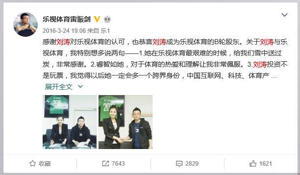 2016年4月,乐视体育进行B轮融资,北京普思、安星资产、中金前海、新湃资本、中泰证券等20多家机构参与,孙红雷、刘涛、陈坤、霍思燕、贾乃亮等10余位个人投资者跟投,分别以现金、债转股形式增资乐视体育共计78.33亿元。