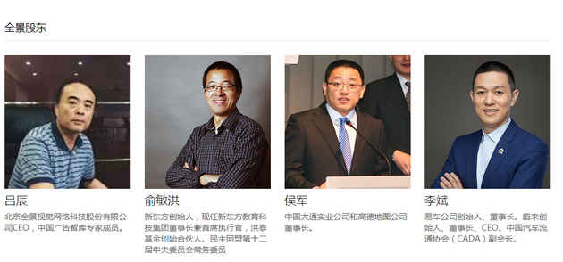 据“全景”官网介绍,该公司股东有新东方创始人俞敏洪、高德地图董事长侯军、易车公司创始人李斌等。