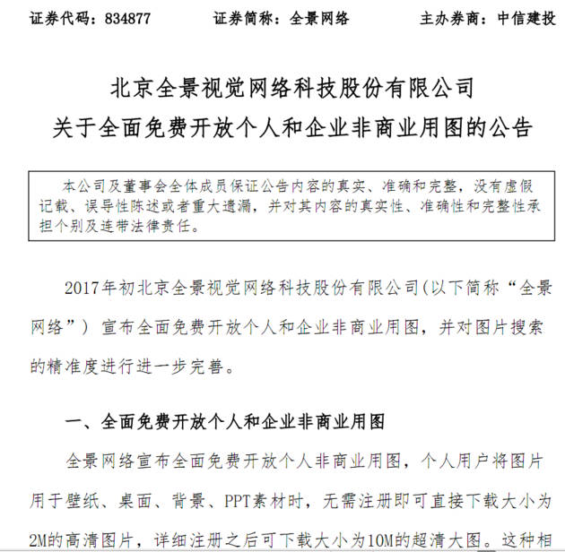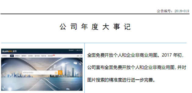 全景网络不仅在2017年报中宣称全面免费开放个人和企业非商业用图,还发布了专门的免费开放非商业用图公告。