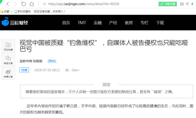 自媒体蓝鲸传媒称,视觉中国被质疑“钓鱼维权”,自媒体人被告侵权也只能吃哑巴亏。