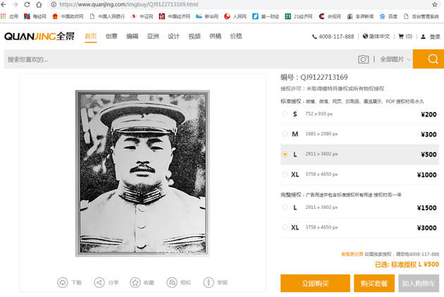 《每日经济新闻》发现,“全景”网站上面国旗、党旗、伟人肖像等图片信息当中的授权许可,明确写着“未取得模特肖像权或所有物权授权”或“未知’,但仍可在线支付,“标准授权”价格从200-1000元不等,“完整授权”有1500元、3000元两种价格。