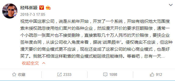 去年7月3日,微博认证经纬中国创始管理合伙人张颖发文批视觉中国,称其有组织地大范围搜索未授权疏忽使用他们图片的各种企业,然后漫天开价的要求巨额赔偿,通常一个小疏忽一张图片也不接受删除,直接索取几十万人民币的天价赔偿,要挟企业签年度合同。