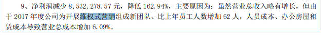 全景网络在2017年的公司年报里公开讲道,为了开展维权式营销组成新团队,比上年员工增加了62人,由此导致人员、房屋租赁等营业总成本增加6.09%。