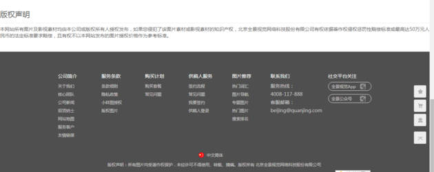 但在“全景”页面下方的版权声明中却宣称:本网站所有图片及影视素材均由本公司或人授权发布。