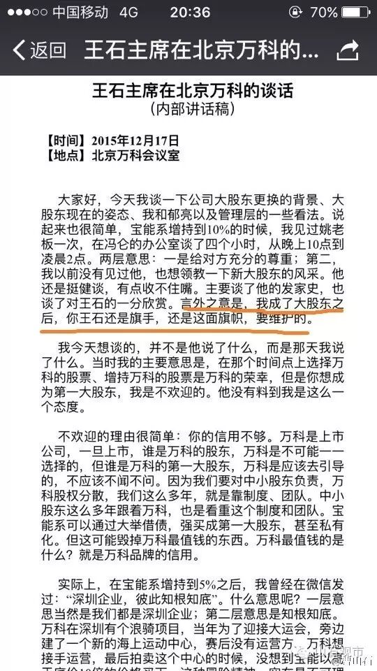 15年12月17日,王石在北京万科会议室对高管发表内部讲话,透露冯仑撮合姚振华和王石在其办公室夜谈,近四个小时。姚始终没交底举牌目的,当面说:王石这面旗帜是要维护的。