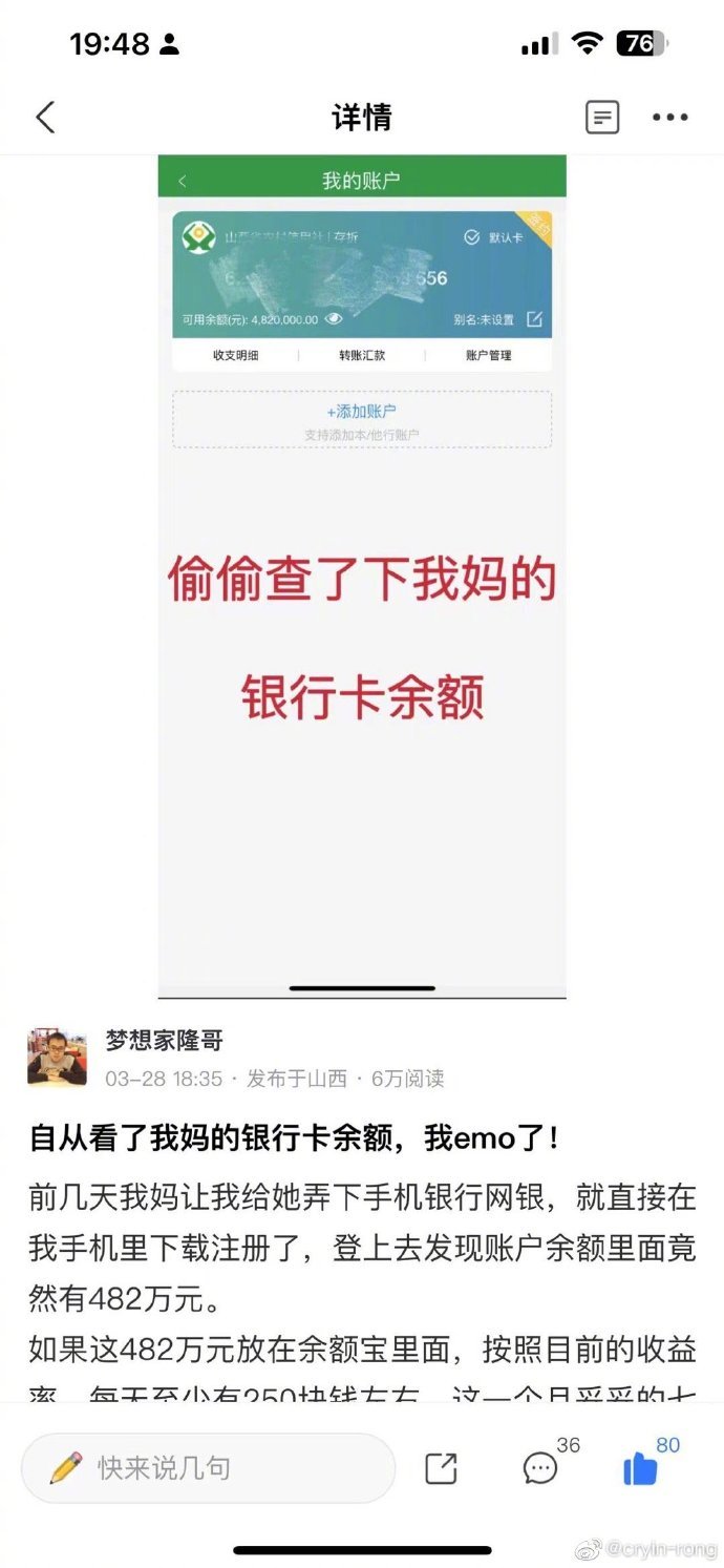 我婆婆家是自己做生意的,不是当月嫂的,所以手里有闲钱。另外我们也不是什么江苏苏州的,更没有人在上海打工。 我们定居在山西太原,父母在长治。那张截图上面银行标志是山西农信社的标志,尾号656银行卡也在我们自己手里。对于月嫂能不能干20年攒482万元,我不知道,但我认为很难。希望各位网友可以明辨真假。